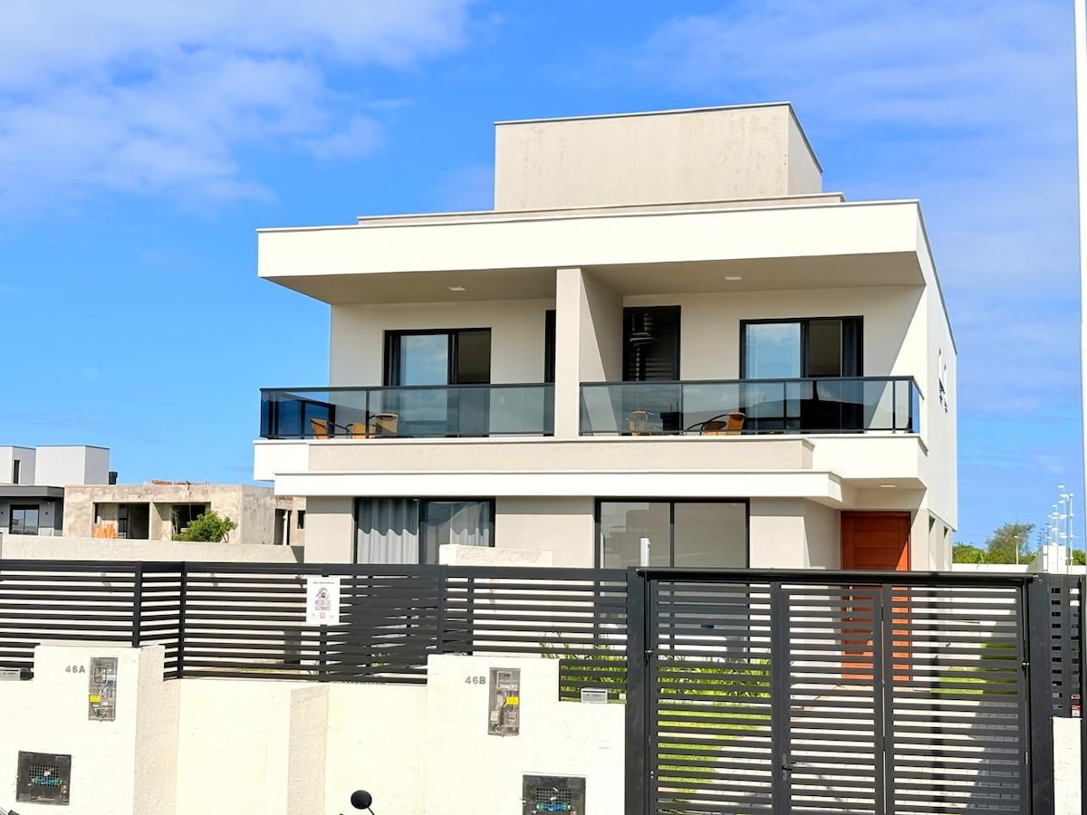 全新單間公寓!建築設計,舒適實用設計。 穩定而強大的互聯網,非常適合在同一地方工作和玩樂,距離海邊400米。 定制傢具、新電器、專為您的經濟和實用性而設計、冷氣、所有水龍頭的熱水、洗衣機、43英寸電視、Dolce Gusto咖啡機、ClaroTV、迪士尼和Netflix。 家庭建築,安靜,有泳池和車庫。 無論是休閒或工作,弗洛里亞諾波利斯都是完美的住宿選擇。