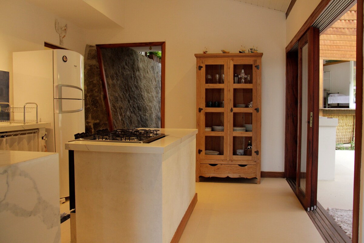 非常適合雙向體驗! 65平方米的平房,舒適,高天花板和裝飾精美,位於Fazenda Arrozal公寓,靠近Siriuba海灘,Ilhabela以北。 非常適合2人入住。 它有一張超大雙人床、空調、帶爐子和迷你冰箱的小型廚房、小型起居區和陽台。 令人驚嘆的室外區域、按摩浴缸和清爽的瀑布、火坑、吊床、淋浴、藤架和令人驚嘆的景觀!