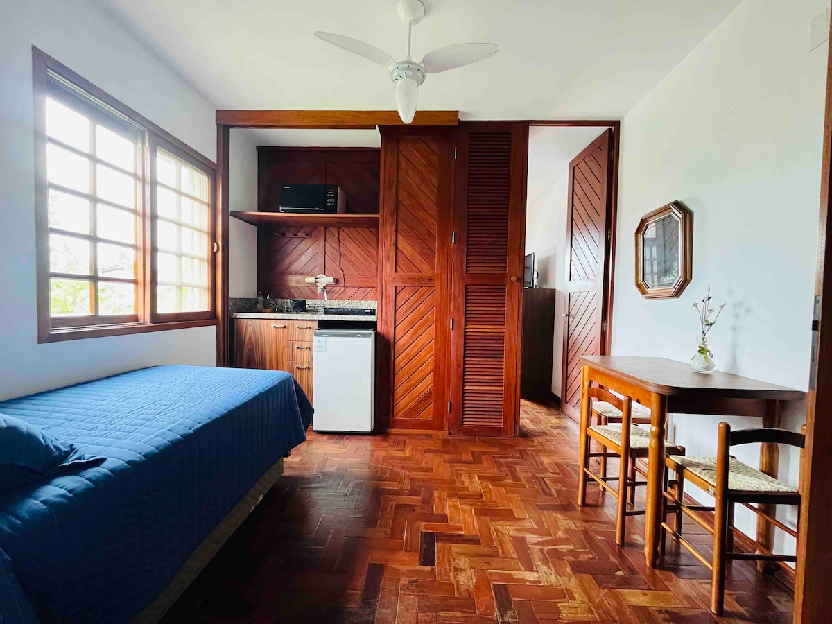 POUSO DO GUARANI | 套房位於住宅區,設有獨立入口,旅館風格,配有獨立浴室,地理位置優越:距離海邊200公尺,距離英格萊斯中心800公尺。私密、舒適和實用:240MB WiFi、電視、分體式空調、沙發床、迷你冰箱、吹風機、熨斗、電熱水壺、微波爐。套房位於一樓,因為它是木製的,所以可以聽到樓上套房的腳步聲。沒有車庫。