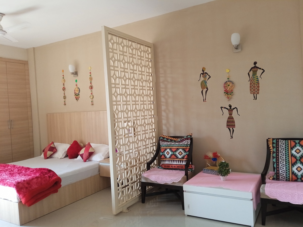 *在這間擁有獨特裝飾的寧靜豪華公寓中放鬆身心,非常適合情侶或三口之家。 享受現代舒適,輕鬆前往Vrindavan的寺廟和景點。 * Premanandji padhyatra darshan-400米(步行5分鐘) *從舒適的陽台上欣賞美麗的日出,開始您的一天,享受yamunaji darshan和孔雀聲。沉浸在舒適的床上,感受積極的氛圍。