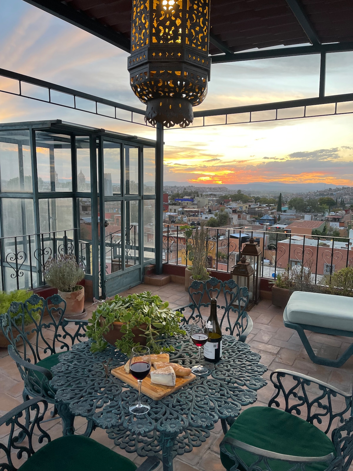 The tallest patio in the entire neighborhood - Casa de las Nuebes (house in the clouds) will not disappoint! A perfect couple’s retreat or 2 friends. This beautiful interior designer owned studio has all the magical qualities that visitors love about San Miguel. Walk just a few minutes from Centro to a gated 6 unit condo unit that is very safe and away from the downtown noise. Enjoy the stunning 360 view of morning hot air balloons, sunsets and all of SMA!