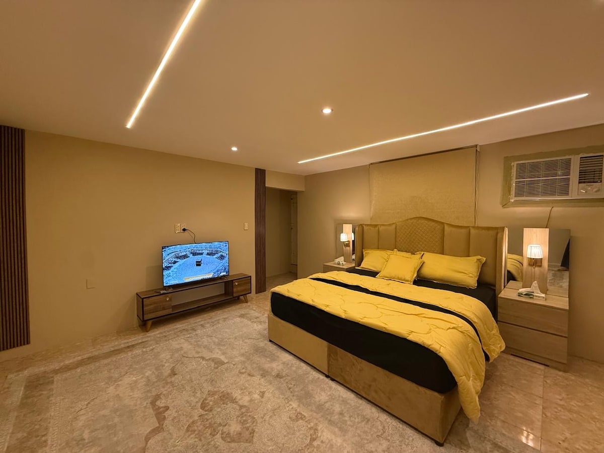 一間臥室公寓、電影院、滿足您所有需求的廚房、優雅寬敞的客廳,提供自助入住,地理位置優越 Al Seef區。靠近所有服務餐廳和咖啡館(距離Rakah海和Zakat一分鐘路程,距離Dhahran Expo 6分鐘路程,距離Imam Abdulrahman Bin Faisal大學10分鐘路程) 它配有60英寸智能電視,配有Shahid訂閱、互聯網、熱水器、最好的床鋪。床褥每天更換,並非常小心地處理清潔和消毒。上帝保佑你