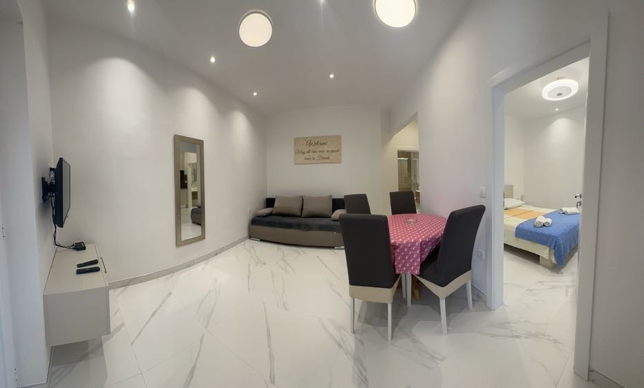 **靠近海邊的新石頭公寓,享有美妙的海景**。 55 平方公尺公寓,可供 2 + 1 位房客入住。寬敞的客廳,配有沙發,可變成雙人床(智慧電視、空調)廚房(烤箱、洗碗機、咖啡機)。1.臥室(大雙人床、寬敞衣櫃)配有馬桶(淋浴間)。公寓有一個私人露臺( 10平方公尺),可欣賞迷人的海景。 露臺上有一張可供4人入住的桌子。