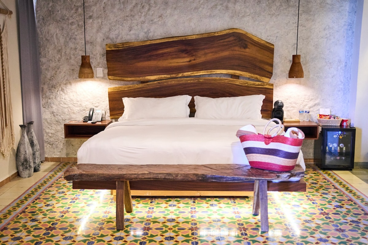 Bienvenidos a Näab, un refugio de tranquilidad y elegancia en el corazón de Mérida, Yucatán, donde la hospitalidad mexicana se fusiona con la esencia del bienestar holístico. Disfruta de nuestras instalaciones que incluyen un spa, un centro holístico y un rooftop ideal para relajarte con el aire fresco, contemplar el cielo estrellado o admirar el atardecer yucateco." La habitación cuenta con una cama king size, un sofá cama individual, frigobar, TV, aire acondicionado.