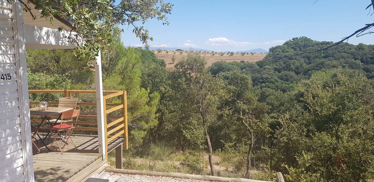 這間漂亮的小木屋坐落在海拔720米的橡樹、松樹和黃杨樹林的中心。 景觀很好。設備完善,住宿愉快。 1間雙人臥室、1間帶拉出床的閣樓、淋浴間、洗手盆和廁所、客廳、小廚房、露台、距離幾米的泳池。 可以同時租用第二間相同的小屋,與朋友一起來,同時保持隱私和獨立。 可攜帶寵物。場地總容量: 4間住宿: 24