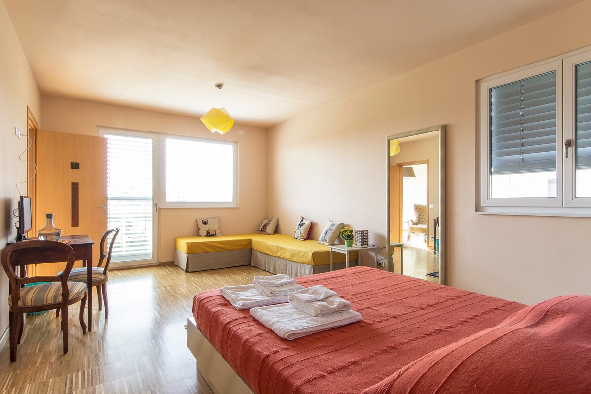 La camera pesce giallo è una ampia e luminosa stanza al primo piano del B&B Casa Fischer. Oltre al letto matrimoniale è possibile aggiungere due letti singoli. Dispone di balcone e ampio bagno privato.