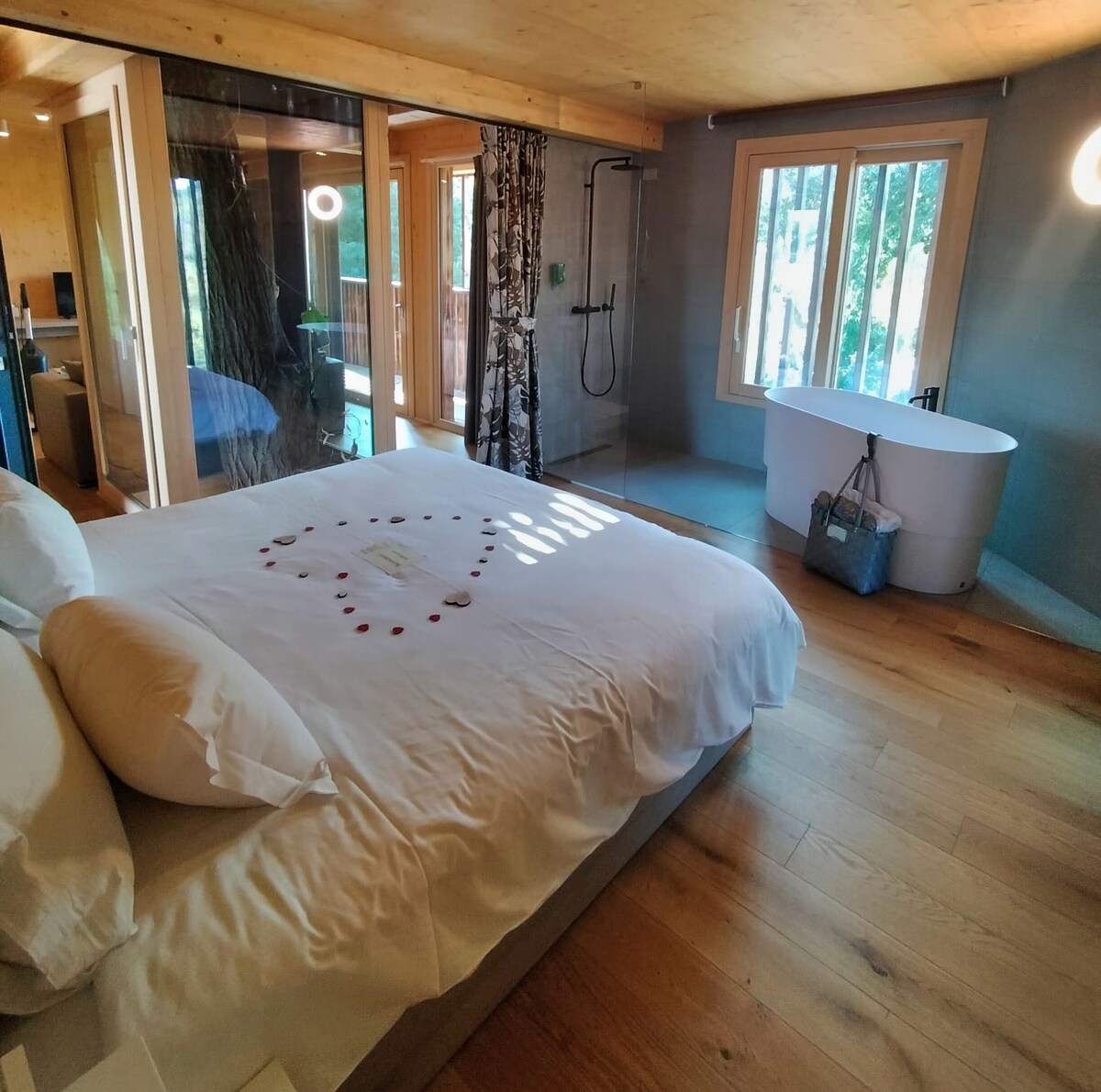 您可以在這棵大牀上樹的花朵中感受到睡眠5公尺的刺激。 套房完全由木材建造,並以天然材料裝潢,符合我們的生態協助性理念。 舒適的加大雙人牀、配有淋浴間和浴缸的區域,以及配有沙發牀、LED電視、草藥茶角和迷你吧的起居區。 露臺是套房客的獨家區域,是天空和河流景觀的非凡觀景臺。
