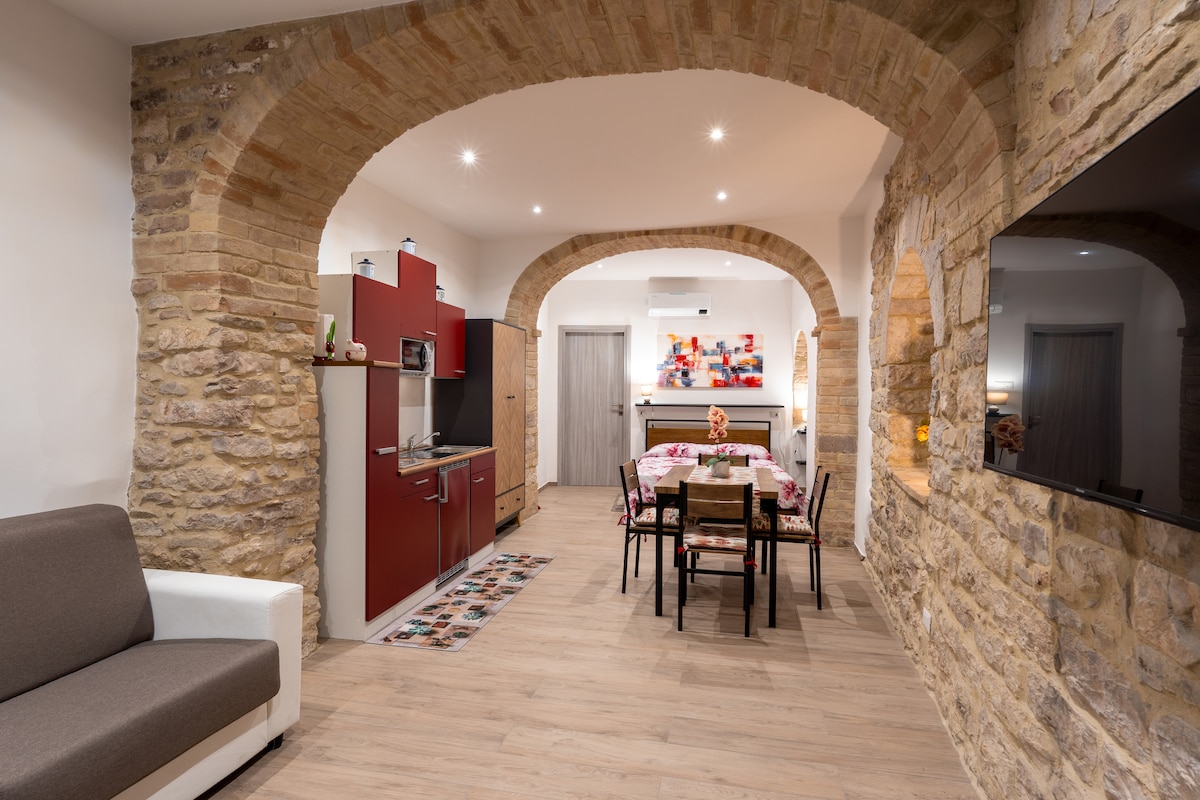 公寓位於歷史悠久的城牆內,距離聖魯菲諾大教堂(Cattedrale di San Rufino)和城市巴士總站50公尺,可輕鬆抵達聖瑪麗亞德利安吉利火車站(Santa Maria degli Angeli)。 公寓完全獨立,位於一個更大的建築內,分為兩層:上層有一個大客廳、一個可用作臥室的陽台和一個浴室;下層有廚房、附帶洗衣房和另一個浴室。