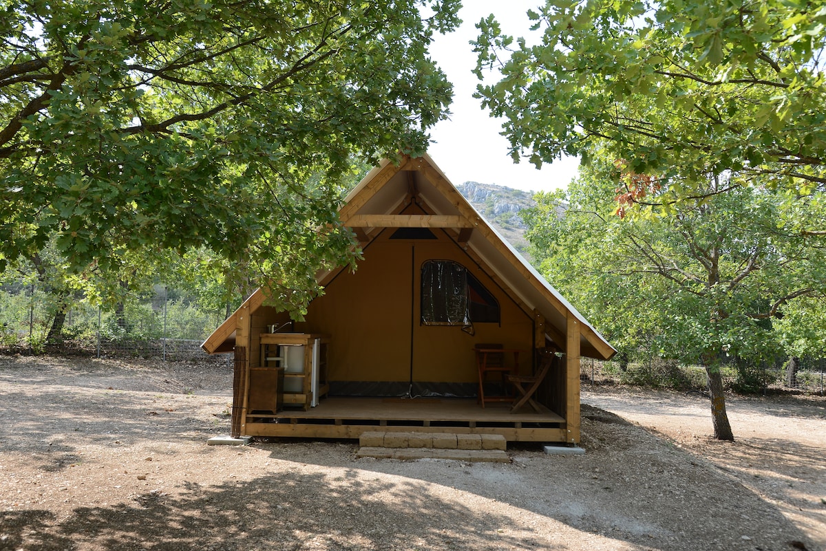 The cosy log cabin is located separately on a small-scale nature campsite, between ancient olive trees. The hut has a living area including a kitchenette and a sleeping area for two people. Around the cabin you can see the peaks of the Gran Sasso on one side and the high mountains of the Majella on the other side. At the terrace there's a lot of privacy. The municipal access road to the site is a little steep. Within walking distance you can find a pizzeria and during the weekend an agriturismo.