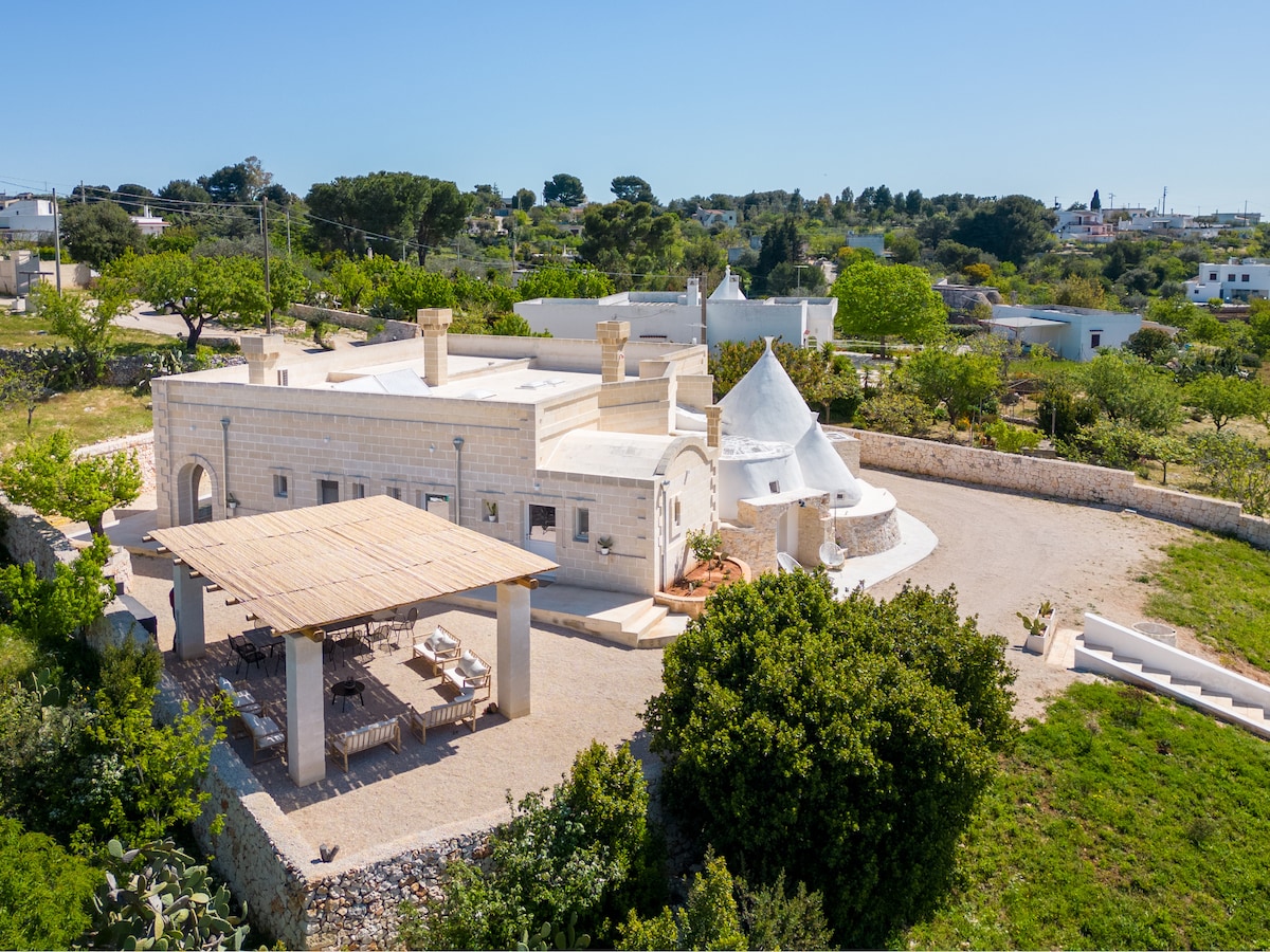The Trullo Apulia is an exclusive property, made by recovering an original ancient historic domed house (called "Trullo Saraceno"), enriched by swimming pool, Jacuzzi and steam room for private use, in a scenic location, just 2 km from Ostuni and 10 km from the beautiful beaches of Puglia. It can accommodate up to 8 people. Note: the reservation fee does not include consumptions of electricity (0.50€/kWh), gas (5€/m3) and the tourist tax (1€/day for each person for the first 5 days) that will be calculated and paid at the end of your stay. Struttura esclusiva con piscina, idromassaggio, bagno turco, 8 posti letto, posizione panoramica, a 2 km da Ostuni e 10 km dal mare. Nota: i costi di consumi elettrici, gas e tassa di soggiorno non sono inclusi nella fee di affitto e dovranno essere calcolati e pagati alla fine del soggiorno. Italian Version Il Trullo Saraceno Apulia è una struttura esclusiva con piscina ad uso privato, in posizione collinare panoramica, a soli 2 km da Ostuni e 10 km dalle splendide spiagge pugliesi. Dispone di 2/3 Camere da letto matrimoniali, 4 bagni (di cui uno con bagno turco, vasca idromassaggio e doccia emozionale), 2 zone living (con 2 divani letto matrimoniali), 2 cucine, 2 camini e può comodamente ospitare fino a 8 posti letto. Atmosfera unica che unisce l’inconfondibile stile mediterraneo ai comfort più moderni, per un soggiorno esclusivo ed originale, all’insegna di relax, privacy e benessere naturale. La struttura è costituita da 2 unità abitative (trullo saraceno con 3 coni + lamia) totalmente indipendenti, ma comunicanti tra loro, separate da una porta con serratura. Ciascuna unità comprende una sala da pranzo con camino, TV a led satellitare e divano-letto matrimoniale, un cucinino completo di elettrodomestici (frigo-freezer, forno elettrico, lavastoviglie, lavatrice, piccoli elettrodomestici)e una camera da letto con bagno privato, completo di doccia emozionale per cromoterapia. Ideale per 2 famiglie di amici che, fatta salva la privacy, possono godere di momenti comuni di relax e divertimento, può anche essere utilizzata come unica unità abitativa, utilizzando una delle due zone living come terza camera da letto matrimoniale. Tutti gli ambienti della casa sono climatizzati e dispongono di connessione internet WiFi. Gli ospiti hanno a disposizione un parcheggio privato. L’intera struttura ha una capacità ricettiva massima di 8 posti letto, mettendo a disposizione dei suoi ospiti ben 4 bagni, di cui 2 interni completi, un’area benessere con bagno turco, aromaterapia, ampia vasca idromassaggio (che si affaccia su una suggestiva parete rocciosa), doccia emozionale con cromoterapia e servizi igienici ed 1 bagno esterno (water+lavandino) con doccia. L’esclusiva piscina a sfioro di acqua salata con idromassaggio è immersa nel verde della macchia mediterranea. Questa oasi di privacy e di relax dispone di tutto il necessario, inclusa una Zona solarium, la doccia esterna ed il bagno di pertinenza. La profondità dell’acqua della piscina risponde ai requisiti di legge per garantire la massima sicurezza anche dei più piccoli. Molteplici sono gli spazi esterni arredati e le ambientazioni minimal chic che consentono agli ospiti di pranzare o cenare su un ampia terrazza panoramica ombreggiata da un gazebo cannucciato o di gustare, appena svegli, una ricca prima colazione all’aperto, in un’area attrezzata proprio davanti alla portafinestra della propria camera da letto, respirando i profumi dei campi, nell’intimità della luce del primo mattino. Al tramonto, l’unicità del trullo e del giardino circostante, vengono ancor più esaltati dall’illuminazione serale, che vi regalerà nuove emozioni ed un fascino indimenticabile, rallegrati dai sapori inconfondibili dei cibi grigliati al barbecue. Il complesso abitativo è frutto di una recentissima ristrutturazione di costruzioni dal valore storico (il Trullo Saraceno dalla caratteristica cupola bianca è ancora più antico del trullo a cono), in cui il sapiente recupero dei materiali, delle tecniche e dei canoni tipici dell’architettura e della storia pugliese, hanno consentito un restauro di interni ed esterni che mantenesse una linea fortemente evocativa e rispettosa dei luoghi, anche nell’arredamento dai colori chiari e naturali, studiati con la massima attenzione ai dettagli e costituito da pezzi unici e originali. Il fascino della location non conosce paragoni: la costruzione si affaccia su un giardino terrazzato caratterizzato dai tipici muretti a secco, oltre i quali si apre, a perdita d’occhio, su un’area di circa 6.000 mq di pertinenza esclusiva della casa, una valle di magnifici ulivi secolari su terra rossa. Un agrumeto, un frutteto, ampie aree di macchia mediterranea tra le quali trovano spazio molte piante ed erbe aromatiche, dischiudono immagini, in un tripudio di colori e profumi di natura incontaminata che illuminano gli occhi ed allietano la mente. l frutti e gli ortaggi tipici pugliesi, totalmente biologici, sono a disposizione degli ospiti. NOTA: Trullo Apulia promuove un uso sostenibile dell'energia elettrica e dell'acqua (presenti pannelli fotovoltaici e per riscaldare l'acqua sanitaria) e ci piacerebbe che anche i nostri ospiti facessero lo stesso. Per questo motivo non includiamo i consumi elettrici in maniera forfettaria nelle spese di affitto ma saranno conteggiati secondo il consumo effettivo che verificheremo insieme, confidando in un vostro uso responsabile (per il dettaglio, vedi la sezione "Altre cose da considerare"). English Version The Trullo Saraceno Apulia is an exclusive property with swimming pool for private use, in a scenic hillside location, just 2 km from Ostuni and 10 km from the beautiful beaches of Puglia. It has 2/3 Double bedrooms, 4 bathrooms (one with a steam room, whirlpool bath and emotional shower), 2 living areas (with 2 sofas bed for 4 people), 2 kitchens, 2 fireplaces. The whole structure can comfortably accommodate up to 8