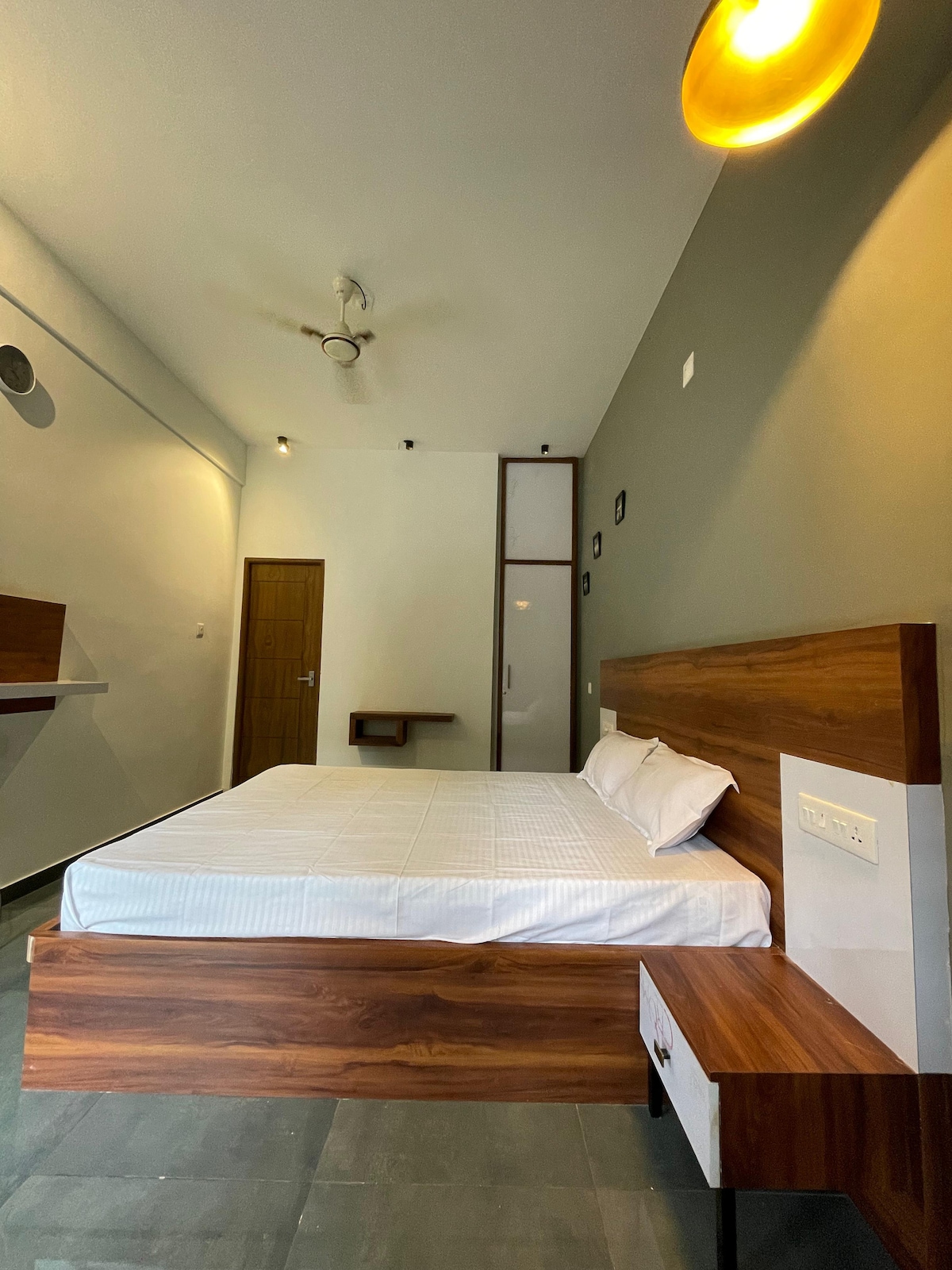 This classy Airbnb non-smoking room on the Ground floor is designed to offer a positive & calm vibe in this chaotic world. Each room has an attached washroom. KINDLY GO THROUGH ALL OF OUR LISTING PHOTOS BEFORE BOOKING. There's a common sit-out, community kitchen (with an electric induction stove for basic cooking) with a common refrigerator, washing machine & RO water purifier on the top floor. PS: This is NOT a 1BHK flat. These are 35 single rooms in a Building.