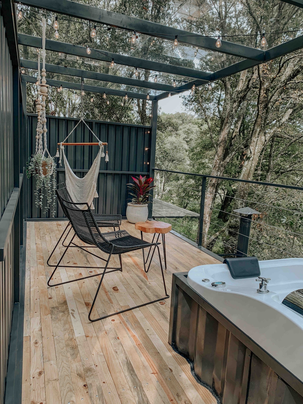 森林中的貨櫃、按摩浴缸、營火