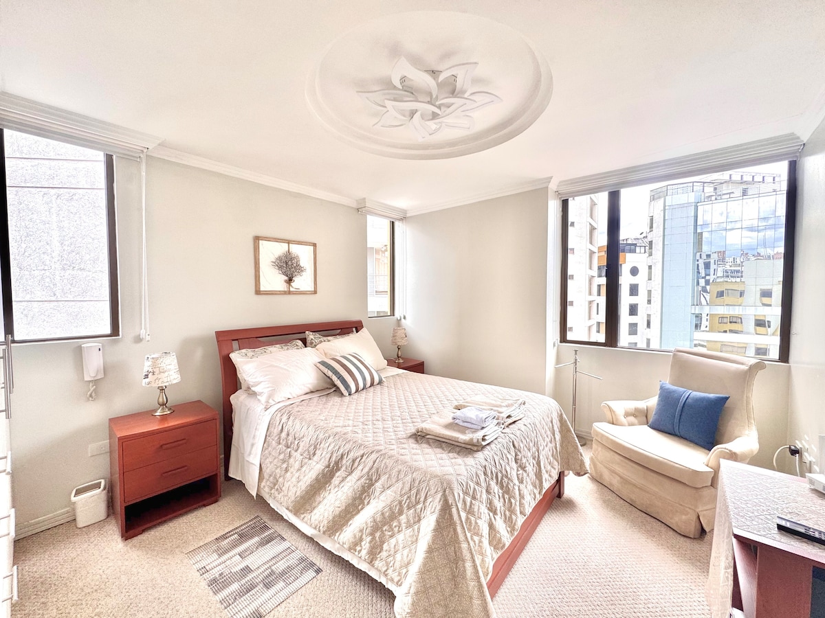 We are located 350 meters from La Carolina Park and the same distance from Metropolitan Park. From the airport, the drive is 40 minutes. Downtown Quito is 5 km away (17 minutes), and the Middle of the World City is 26 km away (40 minutes). Free parking, 24-hour reception, and free Wi-Fi. In the apartment you will find: 2 bedrooms 2 bathrooms living room equipped kitchen, dining room, washer and dryer 2 flat-screen Smart TVs 24/7 security