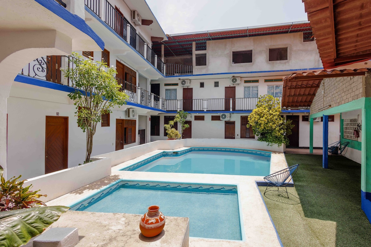 This Poolside Suite features one queen bed and a private bathroom. It has shared access to 2 fully stocked kitchens, one located poolside and the other on the third floor of the hotel. We provide the basics: Drinking water, hand soap, toilet paper, fresh bath towels and beach towels. Extras: Iron, beach cooler, umbrella and more. AC available for an additional charge. Starlink internet View my QR code for access to our guidebook! You will find lots of info. about Puerto Escondido and our area.