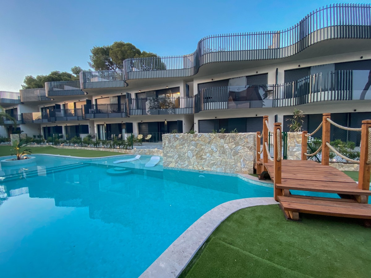 海邊的頂層公寓!私人屋頂露臺,配有水療浴缸和烤架等。高標準的兩間臥室和兩間浴室。設備齊全的廚房,與客廳相通。 適合兒童入住的海邊區域。該區域有三個游泳池(其中一個是溫水泳池)和四個按摩浴池。還有板網球場、籃球場、乒乓球場和健身房。