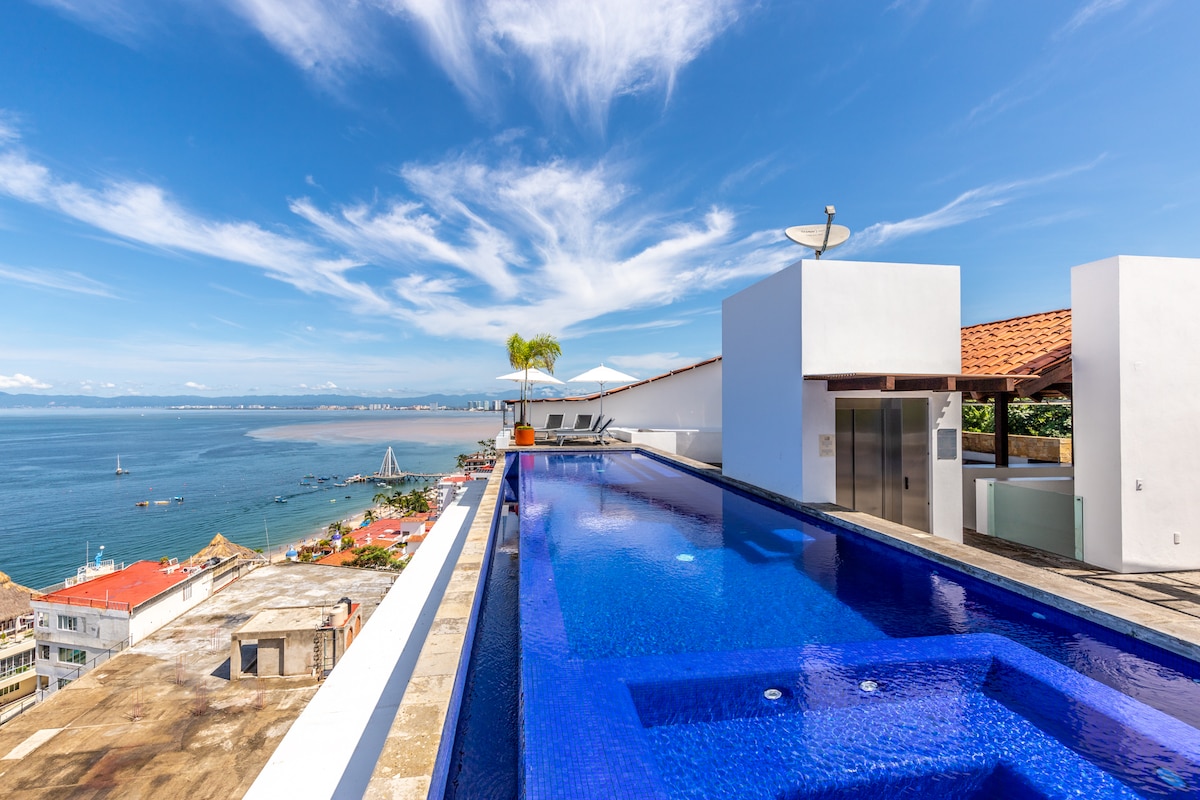 巴亞爾塔港( Puerto Vallarta 's Malecon ) (木板路)的獨家閣樓。 這間閣樓位於木板路正上方,已新翻新。 此房源擁有一切,讓您在巴亞爾塔港享受美妙的住宿體驗、無與倫比的地理位置、迷人的海灘景觀和高端裝飾,讓您感覺像住在五星級飯店一樣。 附近有所有餐廳、酒吧、夜店和商店,這間閣樓為您準備就緒。 閣樓設備齊全,讓您不必擔心任何事情。