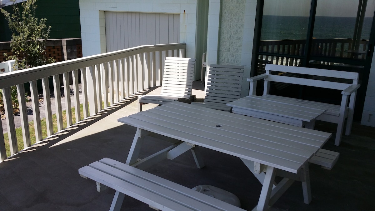 Right on top of the beach the private deck overlooks the endless Pacific Ocean From sunrise to sunset!🌅 A beautiful long white sandy beach, perfect for long walks, swim, paddle or grab a boogie board Gather shells, catch a fish or dig for tuatua’s , all right on your doorstep Inside is homely and well stocked Instant relaxation loads of sunshine and comfy couches, aircon avail. Sit back enjoy the view with the peaceful sound of the waves