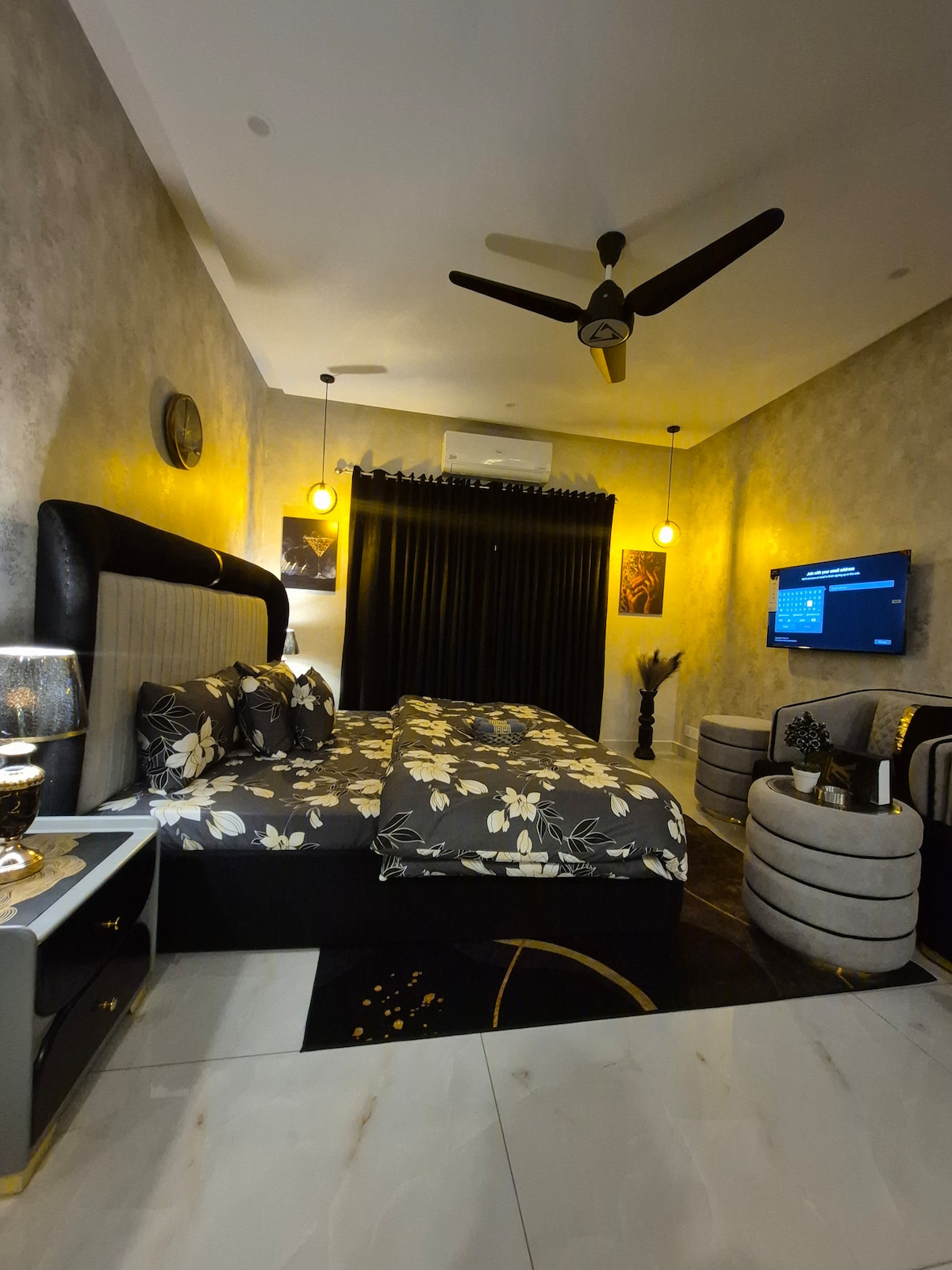 這間現代化、光線充足的睡房擁有時尚的裝飾、柔和的側邊照明和優雅的家具,讓您享受舒適的度假。 溫馨的氛圍營造出放鬆的完美環境,而座位空間、藝術品和高級裝飾等細心的細節則增加了舒適度。 這個空間位於拉合爾的黃金地段,無論您是出差、休閒還是週末度假,都非常適合短期或長期住宿。 - 此相片經過數碼處理,以顯示燈光氛圍,實際佈置可能略有不同