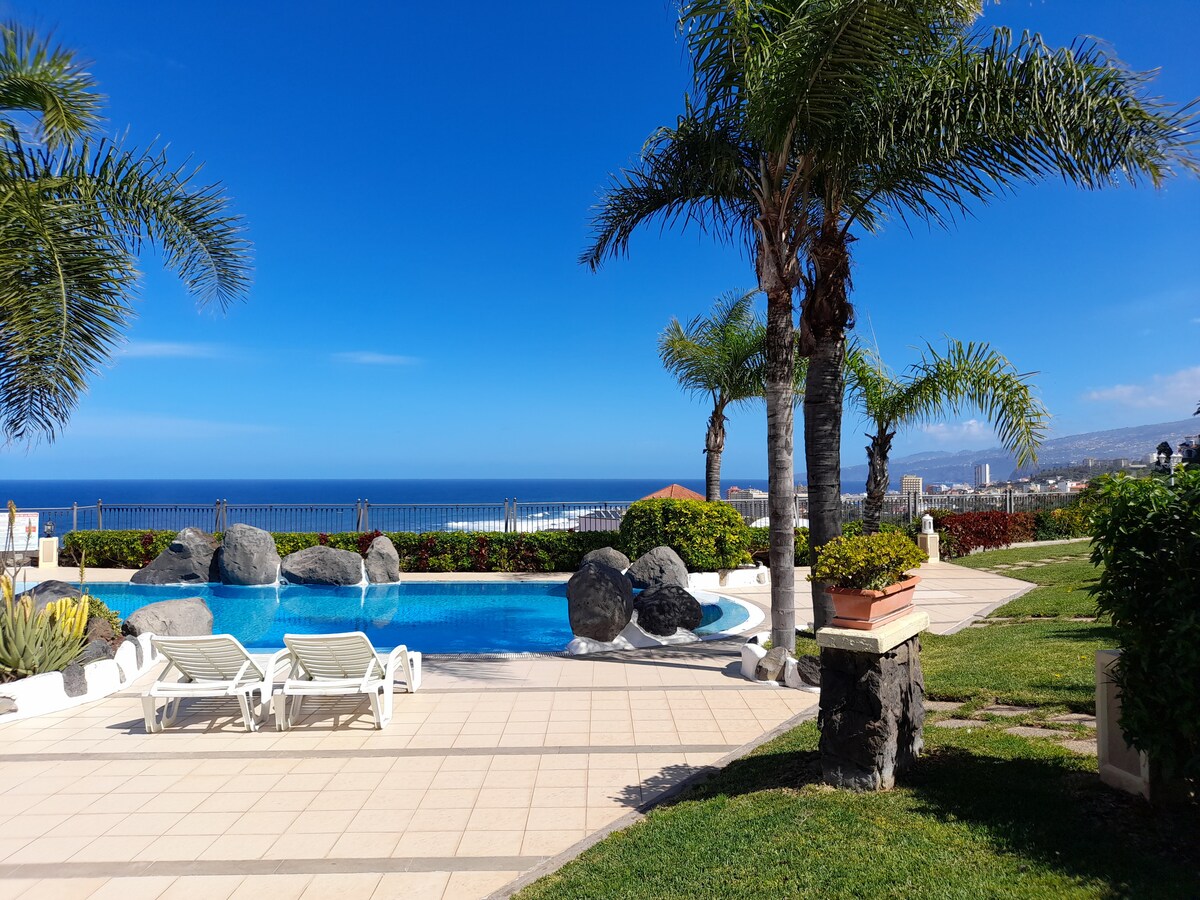 一間有獨立入口的單間公寓,舒適實用,非常適合2人入住。 這是我們房子的一部分,結合了私隱和溫馨的氛圍。 它設有一個大露台,設有日光浴室,是您在海灘度過一天後放鬆、閱讀或享受戶外的完美空間。 位於Puerto de la Cruz的絕佳位置:距離Playa Jardín僅1分鐘,距離Plaza del Charco僅5分鐘,附近有餐廳、休閒和服務。