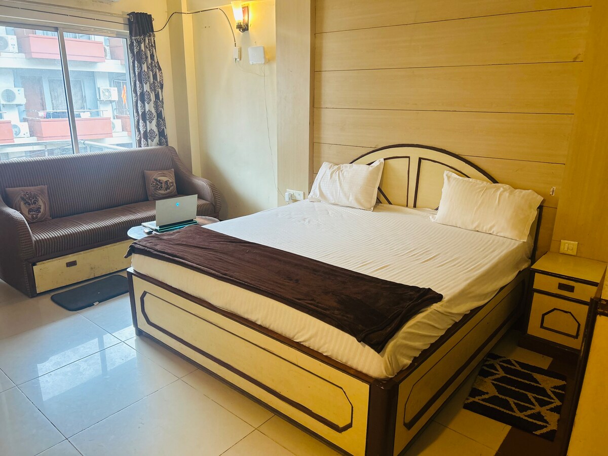 This is a 1Bhk Flat , Best for Small Family (2Adults & 2 child) and Couple. But if you are a group and want to stay together we can provide Extra Mattress. Bedroom: one Double bed with TV & AC , Living Room: Single Sofa cum bed ,Fan & Light. Extra mattress is also There. Kitchen is fully equipped for Four adults. Now cylinder is a global problem. For that we are charging extra per day Rs 300. Refrigerator is there