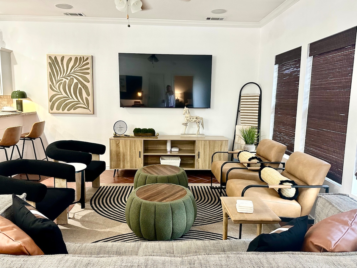Stay in this modern, stylish Midland home located in a quiet cul-de-sac. Enjoy an open-concept living area, fully equipped kitchen, spacious bedrooms, functional office with dual monitor setup, large trailer parking and a private fenced backyard with turf. Perfect for families, workers, and long-term stays. Clean, comfortable, and designed for relaxation, this home offers the ideal West Texas retreat close to everything in town.