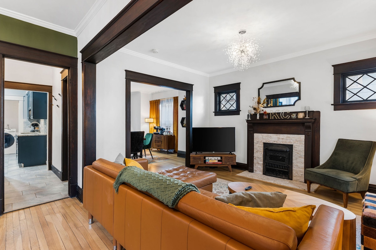 ⛲ Grand 3-level Westport Manor minutes from Plaza, Westport, 39th St & Downtown KC ⛲ 5 spacious bedrooms (3 kings, 2 queens) & 3 full bathrooms, sleeps up to 8 guests in style ⛲ Master suite w/ king bed, walk-in shower & private Smart TV retreat ⛲ Open floor plan w/ cozy living room, Smart TVs & dining for 10 ⛲ Gourmet kitchen fully stocked + option to arrange a private chef experience ⛲ Large fenced backyard, front porch seating, full laundry & high-speed WiFi