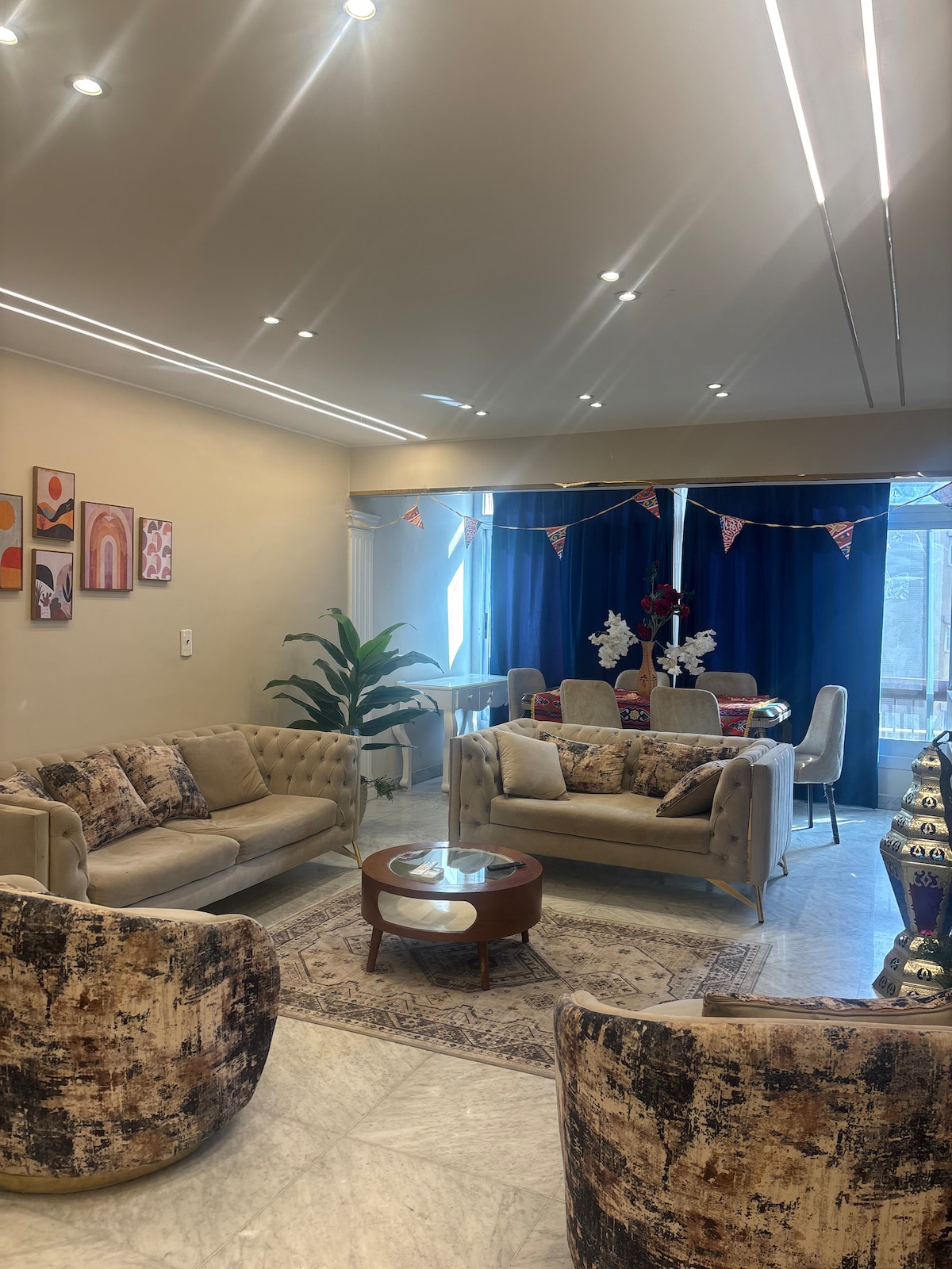 位於Nasr City中心的3間臥室公寓,非常適合家庭和團體入住。 享受寬敞的陽台、快速的Wi-Fi、現代化的廚房和舒適的休息室,距離頂級商場、餐廳和所有城市景點僅幾步之遙。 🏡 房子 這間新裝修的公寓位於電梯大樓的4樓,真正融合了風格和功能: 🛏 臥室 主臥室:加大雙人床、套房浴室、大梳妝台、冷氣和柔軟的床單。