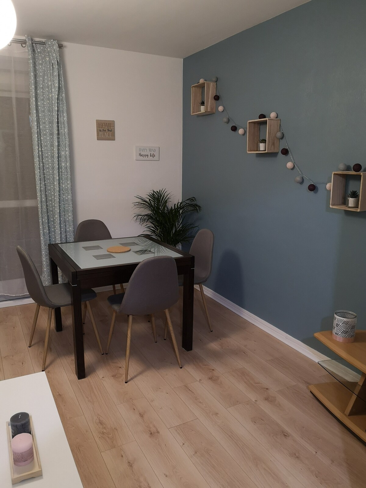 Gîte chez l’habitant constitué d’une pièce de vie avec cuisine équipée (micro onde, four, plaque induction, Tassimo, réfrigérateur), tv, wifi, 1 canapé et 1 clic clac, 1 table et 4 chaises. Une chambre parentale lit160 , chevet, lampes. Salle de bain, double vasques, baignoire et douche. Portant avec cintres à disposition. Ambiance scandinave (ton des murs gris et blanc cassé) endroit situé à la campagne, relativement calme . A 1km, divers commerces, Domaine du Marquisat , 5kms Château de Quesmy