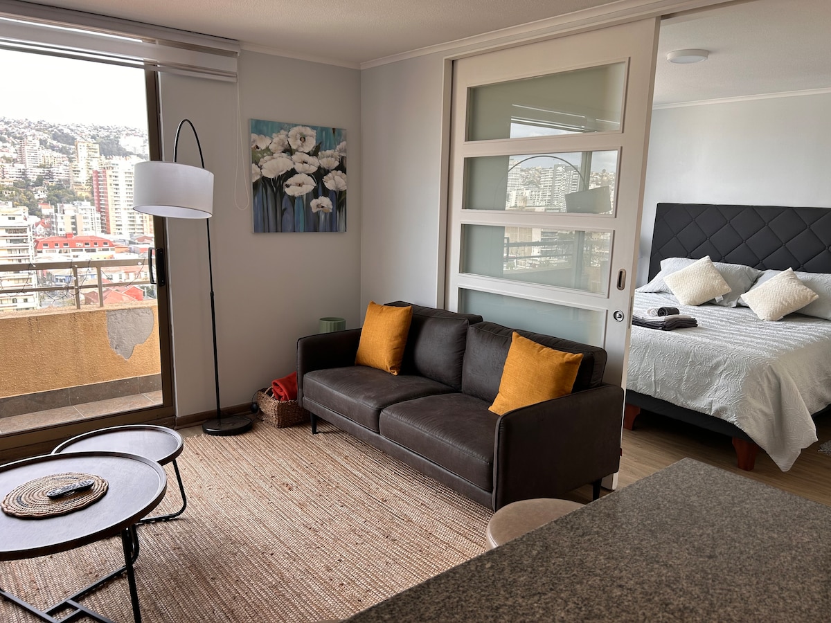 Departamento tipo studio (1 ambiente), muy bien ubicado 📍, cuenta con una cama matrimonial 🛌, totalmente equipado, cocina 🍳, baño 🚿, wifi 📶, TV con netflix 🎬, todo para asegurar una estadía cómoda ✨. A pasos del terminal de buses 🚌, estación de metro 🚇, Quinta Vergara 🌳, plaza Viña 🏙️, supermercados 🛒 y restaurantes 🍽️. Es un edificio moderno que cuenta con áreas comunes: piscina 🏊♀️, gimnasio 💪, quincho 🥩, lavandería 🧺, sala multiuso, sala de pool 🎱, etc.