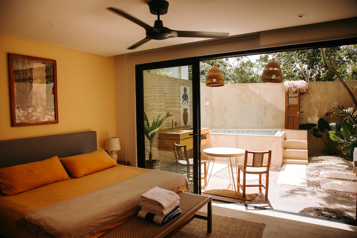Explore the jungle and the caribbean sea of Tulum from our UJO complex is located in the center of Tulum, close to everything and just 6 minutes by car from the beach. Enjoy this paradise! The apartment has a terrace and private pool to relax with privacy, 1 bedroom with a queen-size bed, a living room with a sofa-bed and TV, a fully equipped kitchen and a full bathroom. Our complex has a wonderful rooftop with a common pool and lounge chairs where you can appreciate the Tulum sunsets.