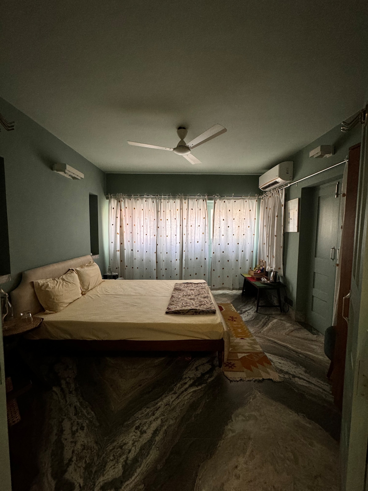 Welcome to our spacious studio apartment near airport with a balcony overlooking a lush garden. The flat design combines the bedroom, living area, and kitchen into one cozy, inviting space. The balcony offers a perfect spot to relax with a garden view. Sunlight streams in, making it a bright and comfortable retreat. The fully equipped kitchen adds convenience. AC is provided in both living and bed room to keep you cool. Enjoy your stay with privacy, dedicated workspace and high speed internet