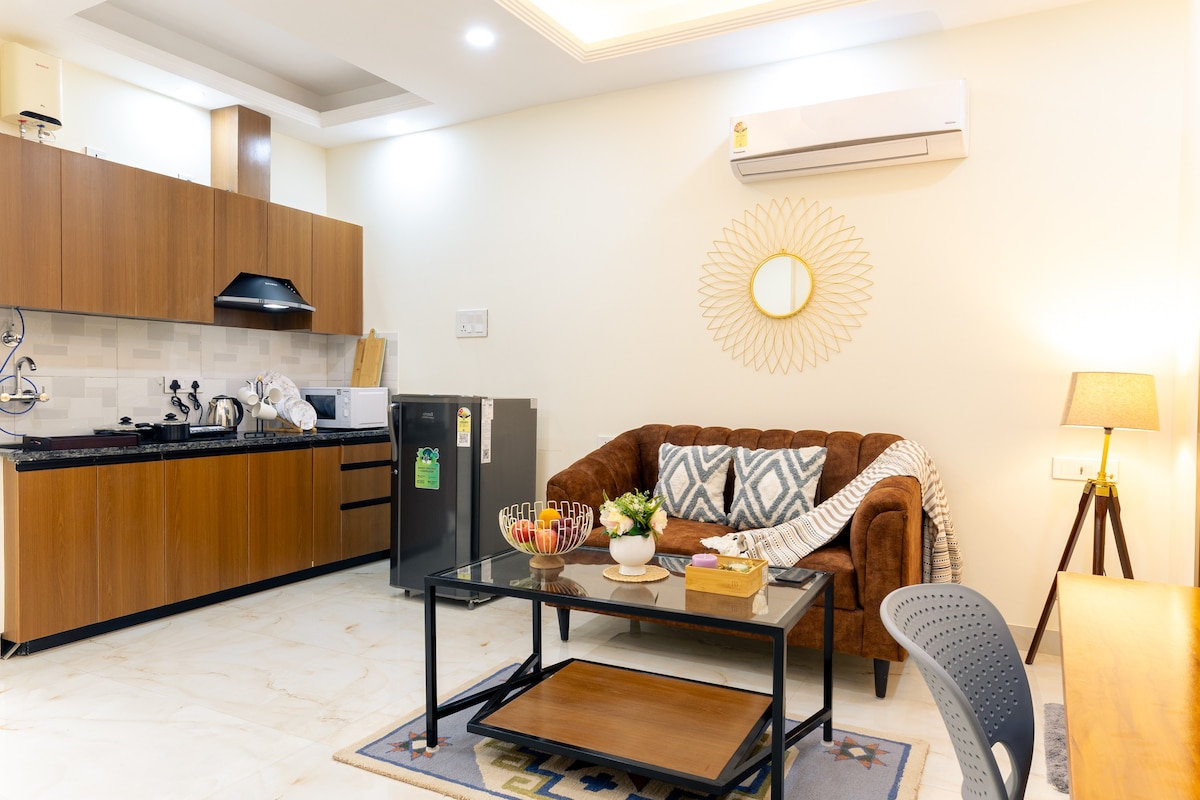 Indulge in the epitome of sophistication in this luxury studio apartment in the heart of South Delhi in Saket. Nestled in a prime location, Enjoy a tastefully furnished space, complete with luxurious decor and ample natural light. With a King Size Bed, Large screen 43" Smart TV, Fully functional pantry and a stylish washroom, every detail caters to a refined lifestyle. Immerse yourself in comfort & convenience. Welcome to a blend of luxury and urban living
