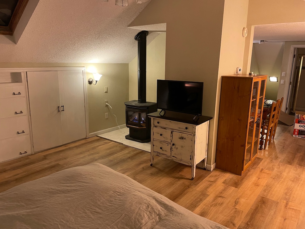 Charming quaint studio on 3rd floor w/- private entry. A comfy queen bed, sofa & 2 bunk beds make it an ideal space for couples & families. In historic MacGroveland, we are right next to Mcalester college & an easy walk to Grand Ave coffee shops & restaurants. Skylights enhance the character of this renovated space, complete w/- its own fireplace. Note, there are three flights of stairs to climb. For large groups, see our lakefront Airbnb: https://www.airbnb.com/h/luxuryretreatbylakebdemakaska