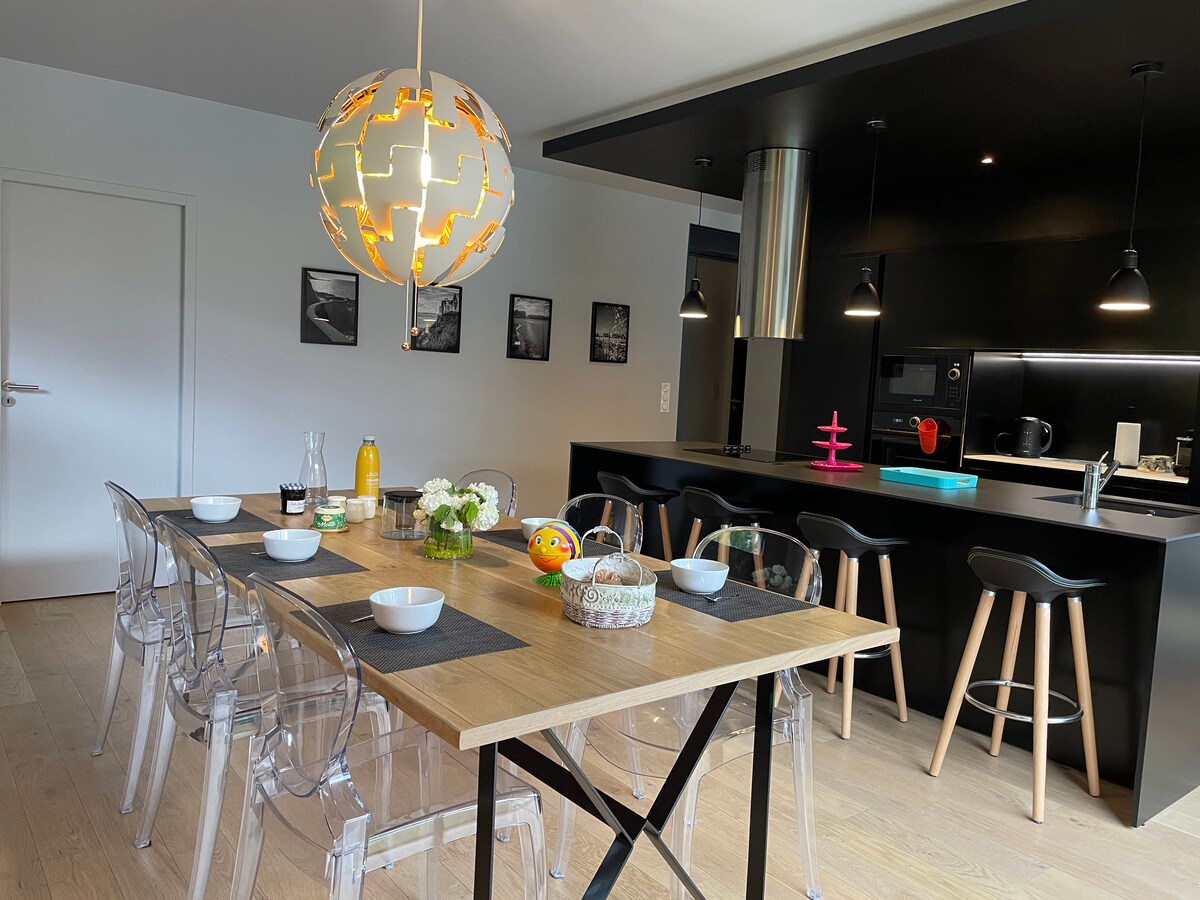 美麗的豪華公寓( 85平方公尺) ,明亮,所有房間都可欣賞海景。 可供4人入住的週租 一樓有美麗的樓梯: 2間臥室、3張牀( 1張雙人牀和2張平易近人的單人牀) ;大電視客廳;盒子/網路;餐廳;設備齊全的美式廚房;帶步入式淋浴間的浴室。 可直達海灘 靠近商店、市場、餐廳、聖馬洛城牆、巴士線路 獨立車庫(需預訂選項)