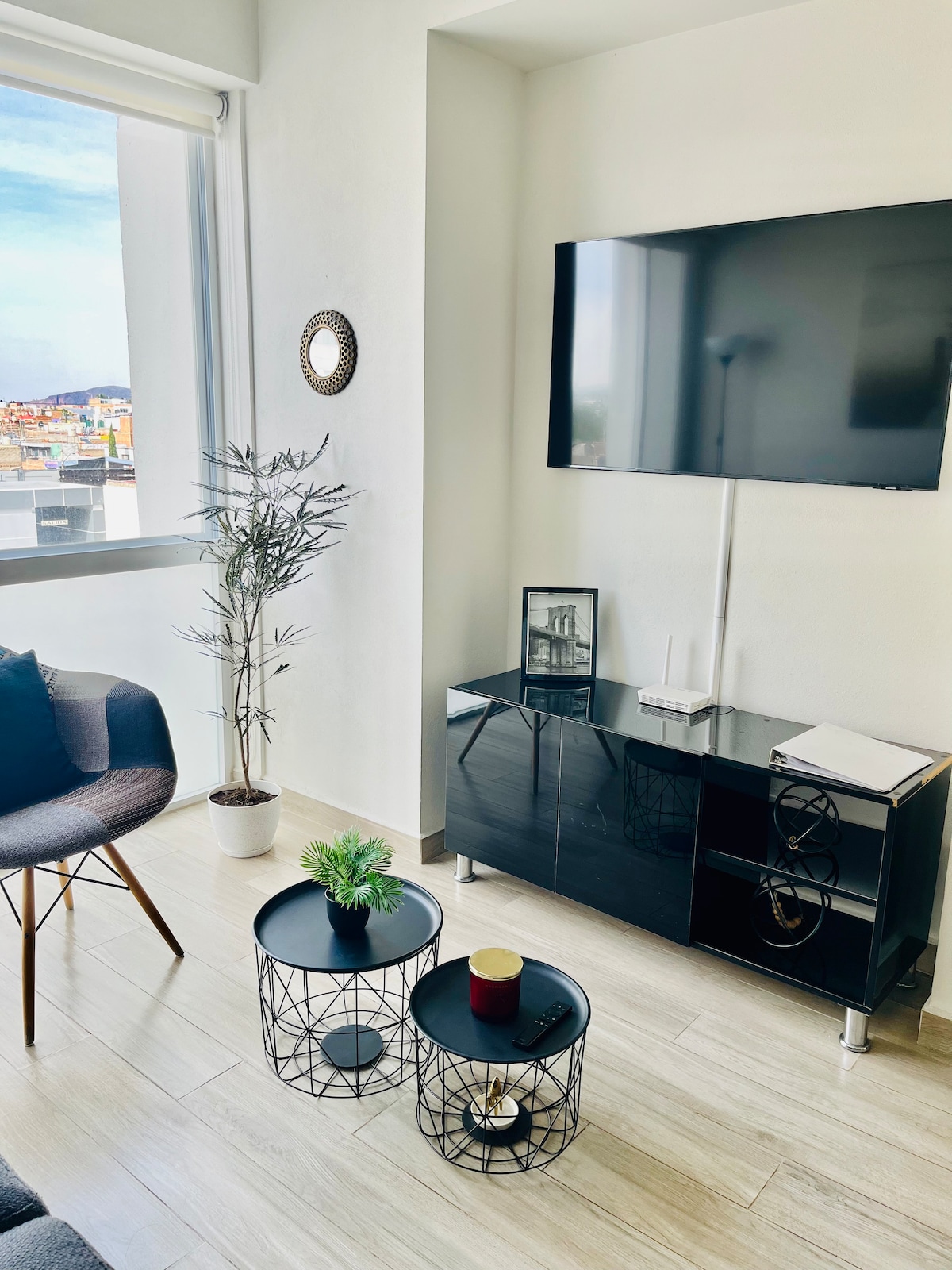 Lupita是一個非常舒適的空間,露臺是房子的中心部分。非常適合4人入住,因為有兩間臥室(加大雙人床和標準雙人床)和兩間全功能浴室。客廳和廚房共用同一空間(請參閱相片庫)。有2臺電視( 55吋和30吋)。第二間臥室有一張辦公桌。我們有300 MB的網路(Telmex Infinitum)。私人非遮蔽停車位。 位於Chapalita市中心的真正小巢穴。完全獨立。向我們詢問健身房-我們有很多優惠!!!