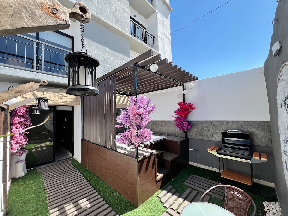 非常適合擺脫日常生活,在公寓露臺上享受大型私人按摩浴缸,讓您和伴侶放鬆身心。 以浪漫和私密的方式慶祝這個特別的日子。 FEDERALTA 位於 Periférico 和 Av Federalizmo。 距離 Telmex 禮堂 8 分鐘 私人停車場 私人露臺配有按摩浴缸和烤肉架。 客廳配有沙發床和 65 吋電視 設備:爐子、烤箱、冰箱。微波爐、攪拌機、咖啡機、3 台 Alexa、2 台電視、吹風機