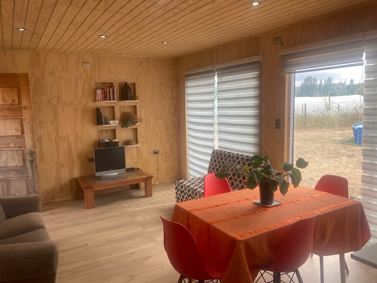 Disfruta de una cabaña de madera, termo aislada, con acceso al río Calle Calle, de renombre en Valdivia. Relájate con toda la familia en este tranquilo lugar, disfruta de entretenciones para los pequeños, huerta educativa y Agroecologica. Cosecha tú mismo, frutillas y hortalizas de temporada. Si disfrutas de la fotografía tendrás la oportunidad de fotografiar paisajes, aves en el sector más biodiverso. Podrás escuchar las aves y sentir que el tiempo se detiene para ti y tu familia. Slow life.