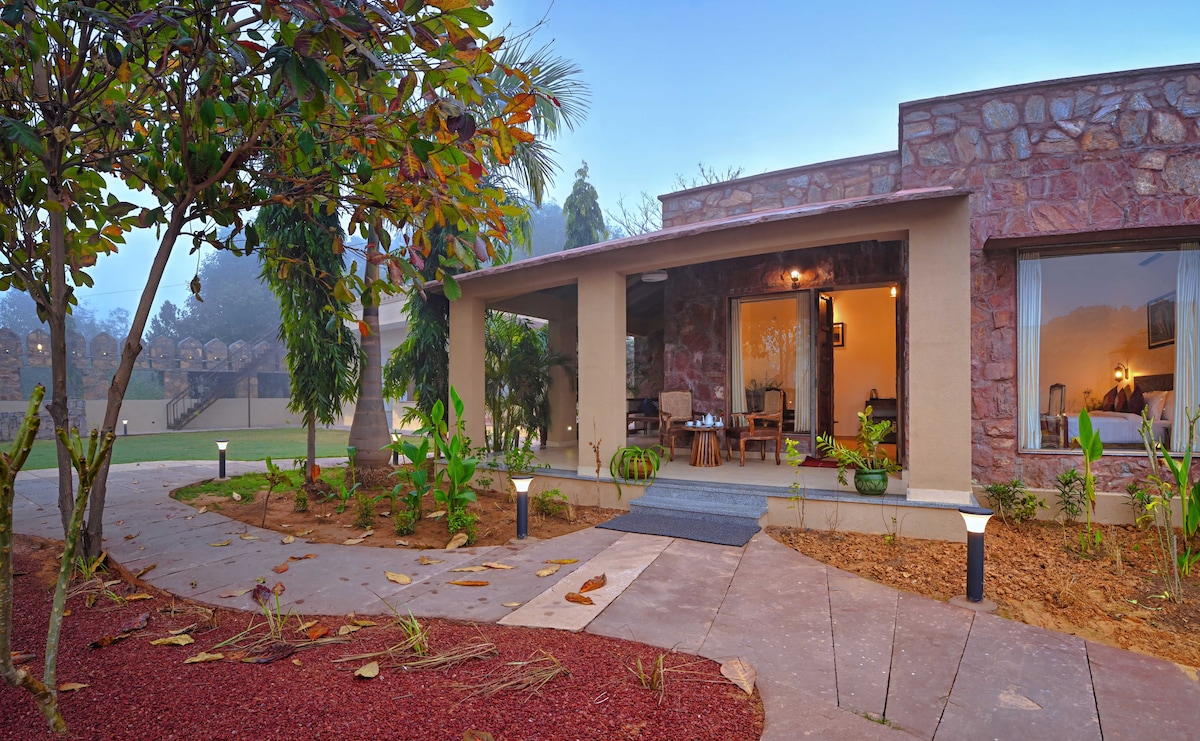 在距離蘭塔博爾國家公園(Ranthambore National Park)僅幾分鐘路程的薩瓦伊馬多浦(Sawai Madhopur)的豪華5臥室別墅中,享受寧靜。 這裏有巨大的露台可供觀星,每間房間都有私人陽台,並可欣賞山丘和森林的美景,是極簡設計和舒適感的完美融合。 無論您是計劃大型家庭聚會、野生動物探險,還是安靜的度假勝地,這間別墅都能提供一切,從寬敞的室內空間到花園新鮮的自家種植水果。