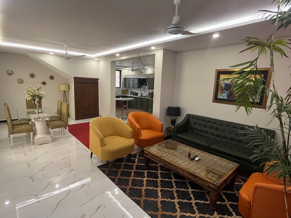 歡迎來到我們位於DHA 5伊斯蘭堡的時尚兩房套房。 在擁有漂亮裝飾和設備齊全的家庭劇院的空間中享受快速通勤和放鬆的便利。 這間舒適的度假屋地理位置優越,非常適合尋求舒適和娛樂的旅客。 這是一個完全獨立的部分,有自己的獨立入口和停車位,適合家庭入住,因此非常安全和安靜。 不可舉辦派對和大聲播放音樂。 不允許未婚夫婦入住。