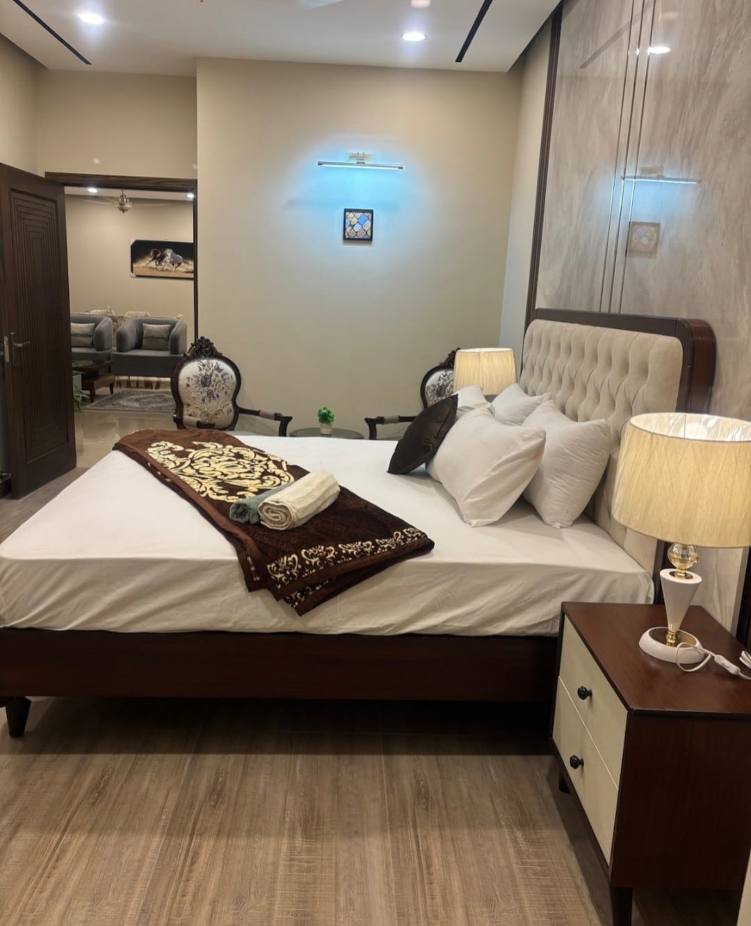 🛏️ Bedrooms: 5 spacious, fully furnished rooms with wooden floors, comfortable beds and wardrobes, mini fridge, reversible AC's and LED TV 🛋️ Living Room&dinning space: 2 Elegant lounges with cozy sofas, and a smart LED TV with NETFLIX & dinning tables. 🍽️ Kitchen Fully equipped kitchen with stove, microwave, utensils. 🛁 Bathrooms: Clean bathrooms with hot water and fresh towels 📍 Location: near F-11 Markaz,mosque, park 📶 Wi-Fi & Essentials: High-speed Wi-Fi, air conditioning, heating.