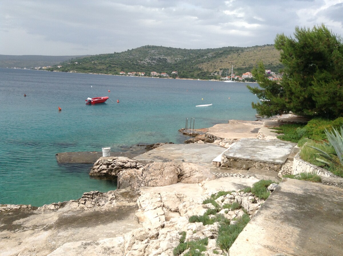 舒適的單間公寓,享有迷人的海景,共用露台。 這間小巧但設備齊全的單間公寓位於海灘旁,距離特羅吉爾僅2公里,是您在達爾馬提亞中部度假的絕佳基地。 美麗的卵石海灘就在街對面,只差幾步。 兩間單間公寓共用露台,每間公寓前都有專屬空間。 請注意,在旺季期間,街邊停車位可能很難找到,甚至離家更遠。