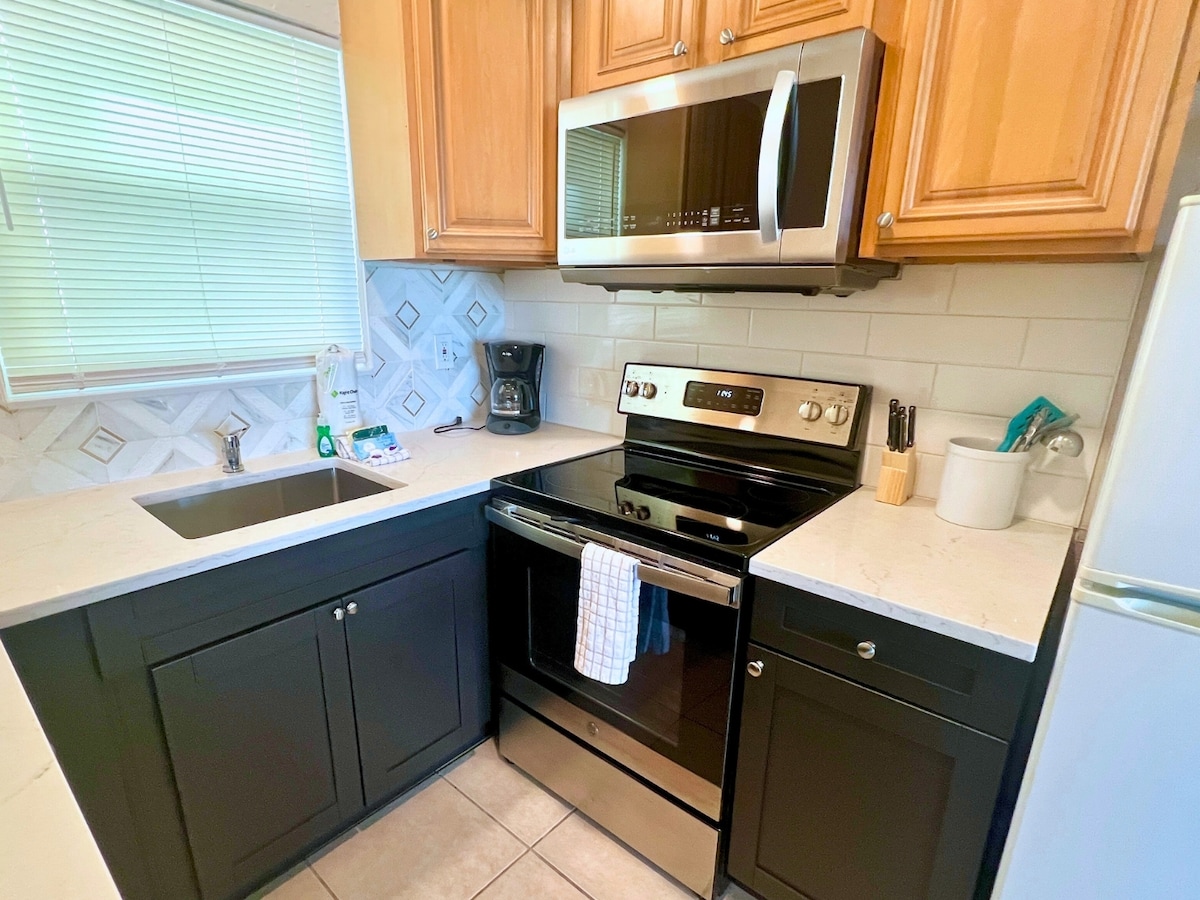 Ready to relax and unwind in this beautifully updated unit? Redington beach is the perfect quiet getaway but only 2 miles from John's Pass! With the beach a short 2 min walk away and its near proximity to Pickleball courts, shops and restaurants; there's plenty of options to satisfy! Comfy King size bed in bedroom, with a sleeper sofa in the living room. Full kitchen with everything needed plus dining area. The location is amazing! Heated pool, BBQ! Park just next door!