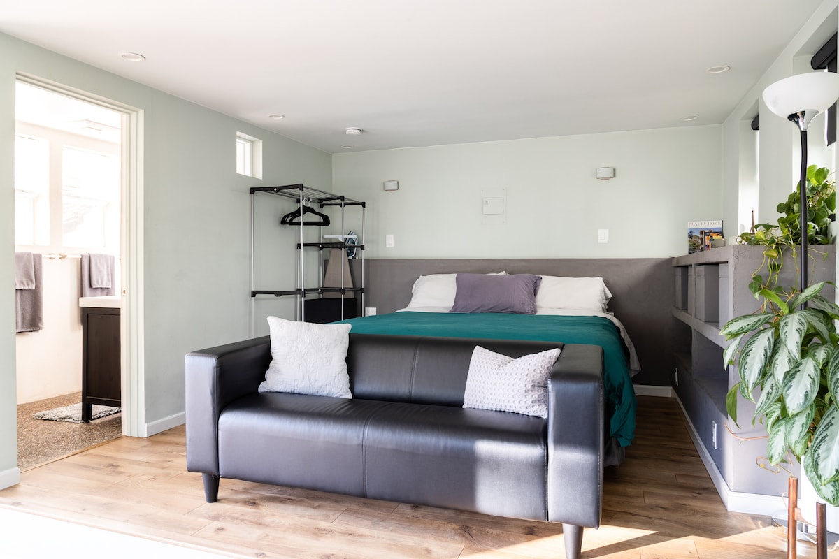 小型獨立單間公寓,配有大床和Tempur-pedic床墊。配有超大儲物抽屜,可存放必需品。便攜式衣櫃、設備齊全的廚房和浴室、後院、門廊、免費停車位和高速網路。 單間公寓非常適合商務旅客。它位於舊金山和矽谷之間的中心位置。前往280和101高速公路很方便。步行即可抵達公共交通工具,以及聖卡洛斯市中心和RWC。參考:院子是共用的,有三隻狗。