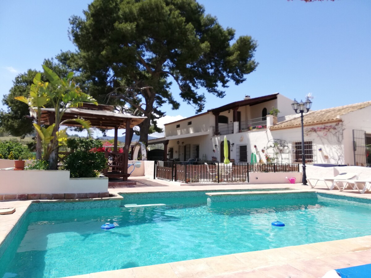 舒適的空調cortijo -坐落在古老的橄欖樹和杏仁樹之間的小村莊和綿延的山坡邊緣。 遊泳池和遊戲室。 適合寵物入住。3間臥室、2間浴室、寬敞的客廳、設備齊全的廚房。 陽光明媚、陰涼的露臺和大型蒼蠅屏蔽內院。 觀鳥者、步行者或鄉村愛好者喜歡待在這裡! 乒乓球、健身房機器、望遠鏡、WiFi、遊戲。8分鐘即可抵達當地酒吧和高速公路,距離海灘25分鐘,距離城鎮15分鐘。