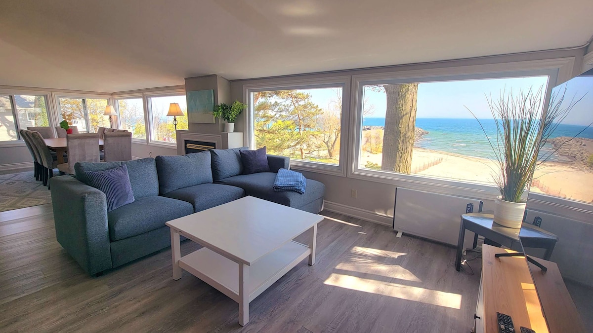 這間位於加拿大南海岸(又稱水晶海灘)的奢華現代房源,讓您沉浸在愛上這裡。 從您進入這個迷人的空間的那一刻起,田園詩般的海濱景觀就有寬敞的地板到天花板窗戶,讓人感受到與眾不同的寧靜感。 一棟新建築,最先進,位於大型私人海濱停車場,配有寬敞的海濱甲板。 您可以享用您最喜愛的早晨Nespresso咖啡或晚間雞尾酒,欣賞海浪在海岸線上傳來的舒適聲音,還有從湖邊吹來的微風。 在美麗的海灘上度過美好的日子,在涼爽的夜晚,依偎在室外的燃氣壁爐旁或室內的燃氣壁爐旁。 這間壯觀的房源配備了房客可以要求的所有設備與服務。 它有兩間設備齊全的廚房,配有專業級電器和設計精良的島嶼座位。 共有6間臥室,其中2間配有步出式陽臺,可俯瞰海灘,其中2間有10英尺高的天花板,另外兩間面向主入口Erie Road。 有兩個主要起居區域。主樓層的一間大房間,配有10英尺的天花板,配有瓦斯壁爐和步出海灘甲板。 毗鄰大客廳是一個私密的用餐區域,配有舒適的宴會座椅,由閃閃發光的水晶吊燈遮蔽。 下層家庭房在壁爐旁邊有額外的座位,配有配對的日光浴牀,可作為超大雙人牀。 還有一張沙發,可折疊成一張額外的雙人牀,供房客使用。 這裡有足夠的空間可容納20位房客,如大家庭、兩個家庭或一羣享受海灘度假的朋友。 有兩個戶外露臺,提供充足的座位,可供戶外用餐和放鬆。每個露臺都配有瓦斯燒烤架供您使用。 主露臺還有一張直接的燃氣消防桌,供寒冷的夜晚使用。 通往私人海灘的樓梯,這是在陽光下放鬆身心的完美度假勝地,在美麗的湖泊中遊泳,這裡有非常淺的步道,非常適合孩子。 它位於水晶海灘的主條道上,步行即可抵達當地餐廳、冰淇淋店和精品店。 這裡也是劃槳和獨木舟的絕佳地點。房源北側有充足的空間存放船隻設備,附近有船隻發射。 我們也有私人浮標供您使用。 自行車和徒步旅行也非常受歡迎,因為友誼步道就在附近。