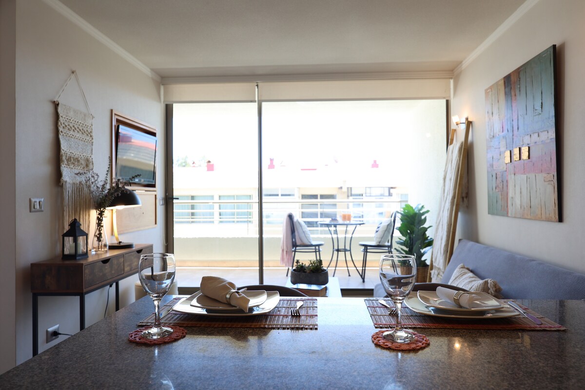 位於Reñaca的精美公寓,設計和裝飾,可供2人入住,他們想從日常中斷連接,醒來時俯瞰大海並放鬆身心。 地點位置優越:毗鄰殼牌加油站和商店。 它在門口有移動。 如果你開車旅行,別擔心,我們有私人有蓋泊車位。 我們還有Wi-Fi、風筒,當然還有床單和毛巾。