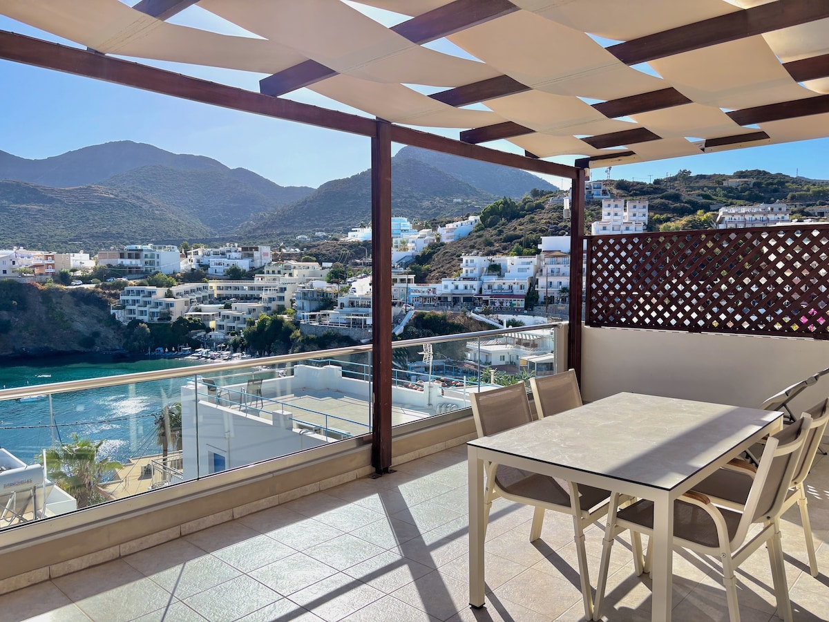 Opening to a spacious terrace overlooking the Cretan Sea, this 36 sq. meters apartment features a separate bedroom and a well-equipped kitchen with fridge and electric hobs. A 43' TV, a safe, free Wi-Fi, air-conditions on all rooms and free housekeeping every 3 nights are included.