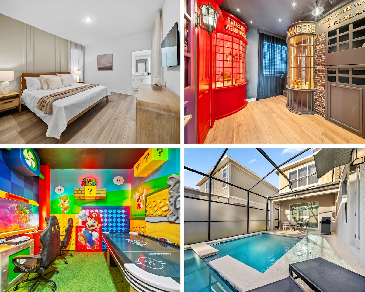 時尚的設計、奢華的舒適和無盡的娛樂,配有2200平方英尺的西南面泳池甲板和戶外廚房,在3.5平方英里的美麗森林中沒有後面的鄰居。您將擁有自己的私人泳池,配有溢流式水療中心、電影室、撞球遊戲室、4間主題房:外太空、漫威超級英雄(配有管狀滑梯)、冰雪奇緣II、哈利波特櫥櫃、PS5,距離迪士尼幾分鐘路程。
