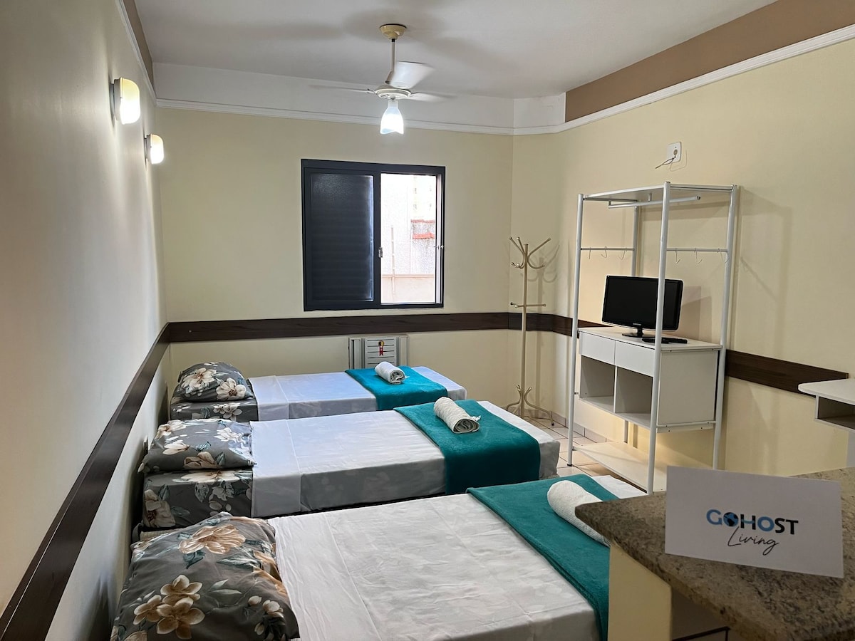 公寓配有空調、每日清潔服務、客房服務、電視、WiFi、雙人床、24小時接待、游泳池、健身室、免費代客泊車。陽臺和臥室與客廳分開。提供床單、毯子和毛巾。不適合攜帶寵物入住。 靠近家樂福、Santa Úrsula購物中心、餐廳、巴士站、會議中心、步行街、商店和Choperia Pinguim! 下午 2 點後入住,中午前退房