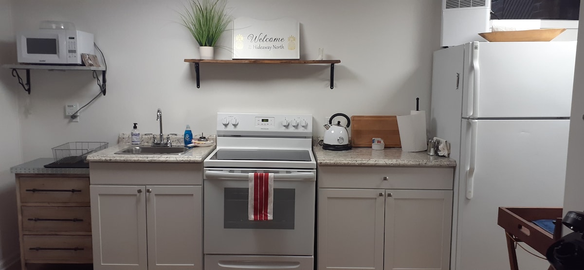 Enjoy a comfortable and peaceful stay in this bright and spacious private suite featuring a large bedroom, private bathroom, and access to an open-concept living and kitchen area. The bedroom includes a comfortable king-size bed with soft linens, nightstands with lamps, and plenty of space to relax. The open living space features a cozy seating area, smart TV, and a fully equipped with microwave, coffee maker, stove, refrigerator, and bar seating perfect for short or extended stays.